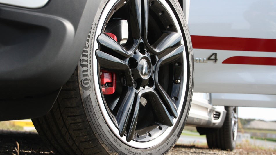Was verbirgt sich also im Inneren des sportlichen XXL MINI? Durch den neuen Ladeluftkühler leistet der Motor 218 PS und ist nicht nur der stärkste SerienMINI sondern Vorreiter für sämtliche Neuerungen der Produktpalette. Der 1,6Liter-4Zylinder Turbomoter leistet 280Nm (im Overboost 300Nm). Das elektrohydraulische Mitteldifferenzial verteilt stufenlos zwischen Vorder- und Hinterradantrieb und die Sporttaste bietet Einstellmöglichkeiten der Gaspedalkennlinie und der Lenkunterstüztung sowie eine mehrstufige Fahrdynamikregelung (DTC). Mit 7,4 Litern/100 km braucht das Schaltgetriebe nur etwas weniger als die Automatikvariante.