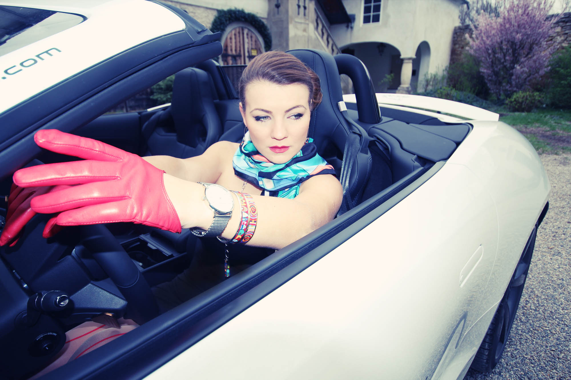 Dieses Editorial ist in freundlicher Kooperation mit Jaguar Österreich und Autohaus Jaguar Land Rover Graz entstanden. Ein großer Dank gilt auch dem Team des Schloss Spielfeld. OUTFIT DETAILS | Gloves by Roeckl* | Accessoires by FreyWILLE | Watch by Jacques Lemans* | Dress & Tights by Wolford