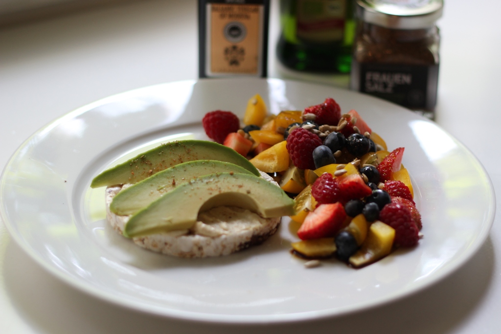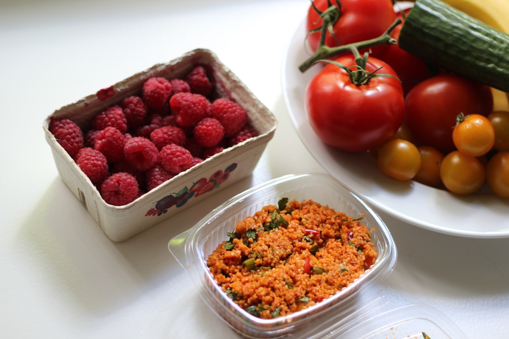 Wie sieht nun mein Speiseplan aus? Ich kaufe permanent frisches Obst und Gemüse, habe immer diverse Nüsse und Körner im Büro und nehme mir beim Türken um die Ecke morgens gern fertigen Couscous mit. Dann habe ich auch immer Humus und Reiswaffeln vorrätig.