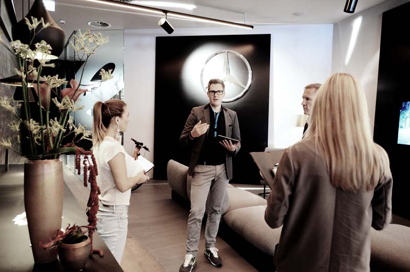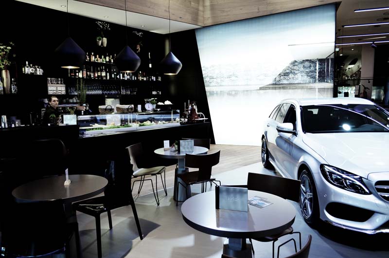ML: Wir wollen die Barriere nehmen, den Besucher einfach auf einen Kaffee begrüßen zu dürfen. Dafür ist es unumgänglich die angebrachte Distanz zu wahren. Ein klassischer Autoverkäufer mit Anzug und Krawatte wäre da nicht förderlich. Das Team wurde sowohl optisch dem Konzept angepasst – jung, sportlich und dynamisch mit hippen Klamotten als auch vom Können. Neben dem Know-how zu den Fahrzeugen ist es uns wichtig, dass die vorhandenen Tools – wie zB der Stream des konfigurierten Wunschfahrzeuges auf die verschiedenen Screens – vom Team genutzt werden. Das sind nun unsere Mercedes Benz Mobile Sales Man. Das Café samt Personal arbeitet zwar eng mit uns zusammen, ist aber ein eigenständiger Betrieb.