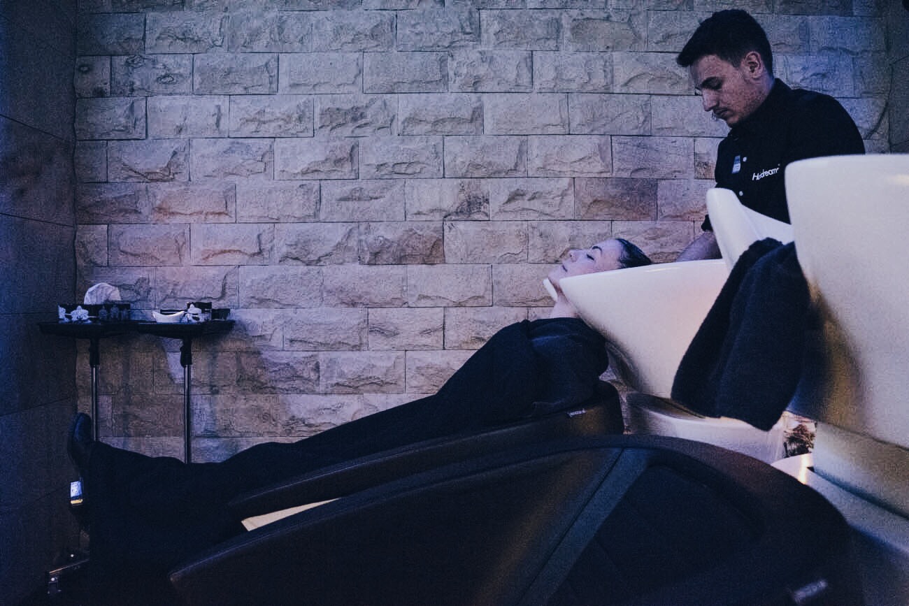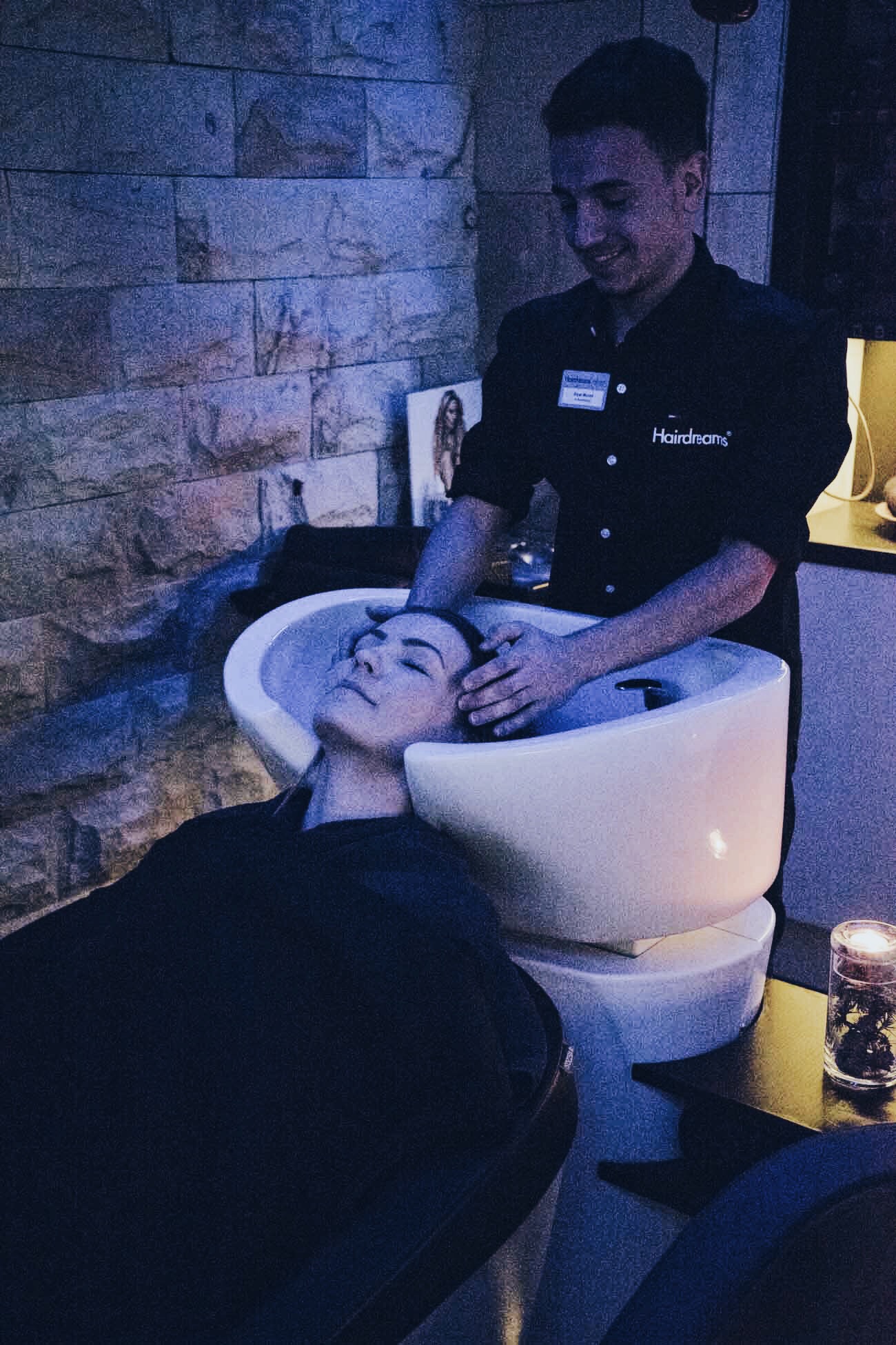 Ich wurde in den Waschbereich entführt, ein Ort, der noch ruhiger, noch ein wenig dunkler war – ich wurde zugedeckt und was 5 Sekunden nach dem Beginn des Haare Waschens geschah, kann ich nicht mehr sagen. Ich schlief. Erzählt wurde mir vom Prozess des Haare und Kopfhaut Ausreinigens – eigens dafür entwickelte Shampoos und Massagetechniken wurden angewandt.