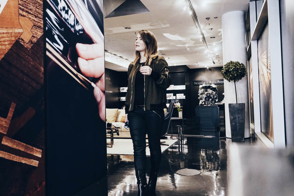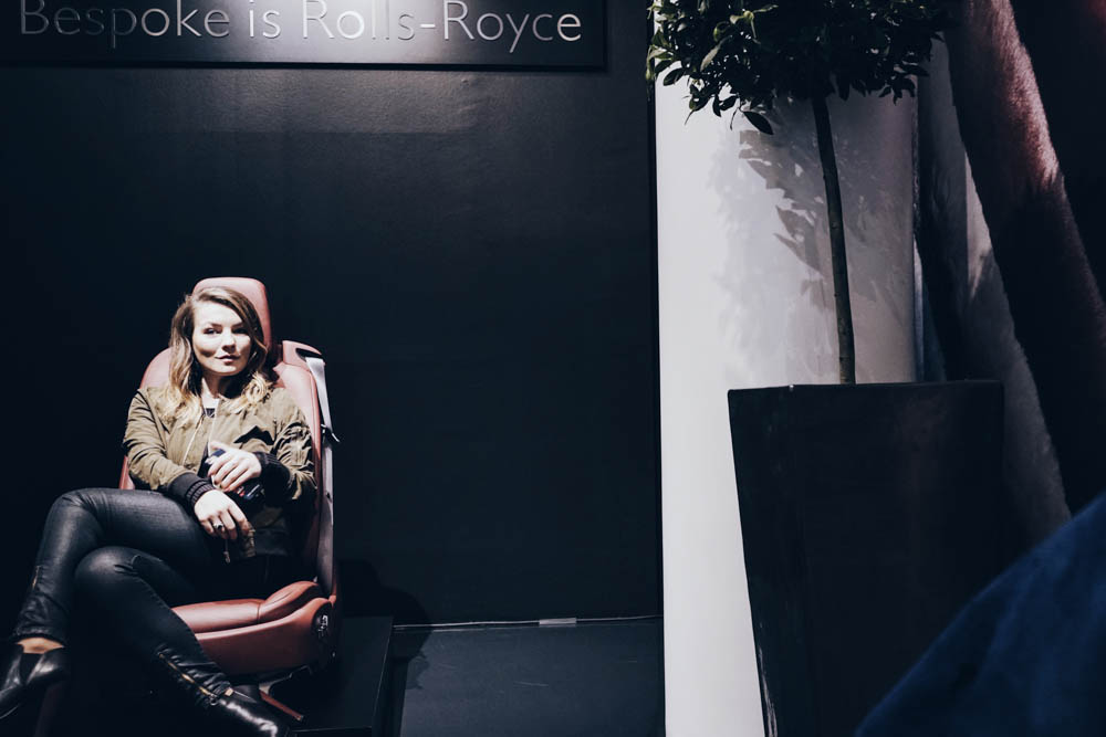 Während ich meinen Kaffee genieße und mich wie im Wohnzimmer fühle, bewundere ich den „BadAss“ des Ghost und frage mich wie nahbar denn Rolls Royce nun tatsächlich geworden ist und ob sich durch ein Chalkboard Nähe schaffen lässt. Die Besucher betreten ehrwürdig das Studio, wagen es kaum etwas anzufassen und bewegen sich auf leisen Sohlen durch die Räumlichkeiten. Ich verliere mich wieder im Geschmack meines Espressos und lass den Blick schweifen. Meine Absätze versinken in einem flauschigen Veloursteppich, ich lasse mich nur kurz vom Flatscreen und dem Imagevideo ablenken und widme mich wieder den Details, den Themen des Studios. Ich entdecke ein Atelier zur Verarbeitung des Leders, fein säuberlich aufgereihte Scetches, eine Vitrine mit Exponaten und einen rosa Thron – wer die Snapchatstory (bemoreimpulsee) gesehen hat, kennt die Diskussion zwischen mir und Robin. Und einen Picknick-Korb versperrt hinter Glas, den Preis will ich gar nicht wissen. Den gesamten Rundgang und Detailaufnahmen findet ihr auf autobild.de