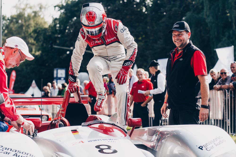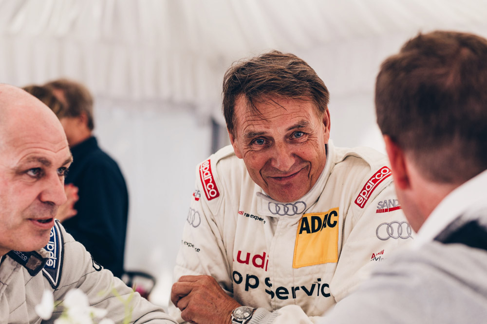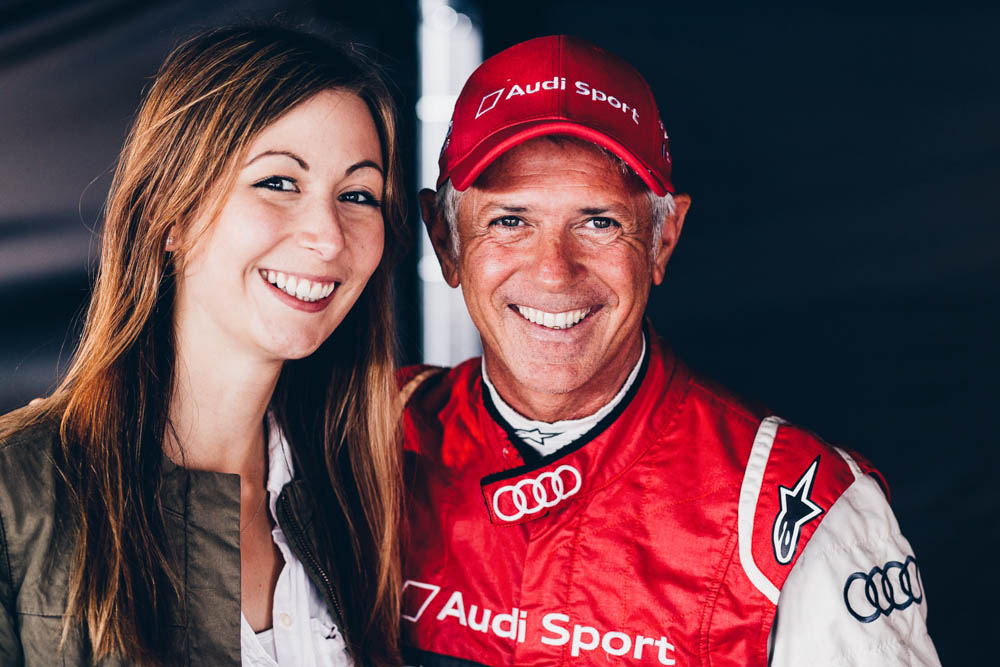 Ich beobachtete meine Gewinnerin, bereitete sie auf das Geschehen vor, holte den Helm und ging in die Box. Dort bekam sie vom Audi Traditionsteam die Besonderheiten der Fahrzeuge sehr genau erklärt und erste Selfies wurden gemacht. Charming war auch das Foto mit dem mehrfachen LeMans-Gewinner Dindo Capello, der mit schönstem Rennfahrerlächeln posierte. Und weil wir von dem Rennflair noch nicht genug hatten, ging es endlich auf den Beifahrersitz des Safety Car. Audi R8 Vergnügen mit Jan Becker, schnelle Runden durch den Stadtpark.