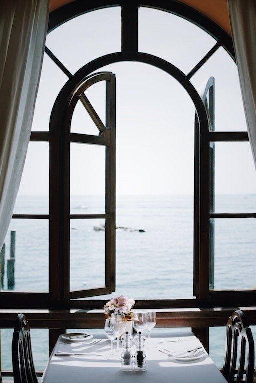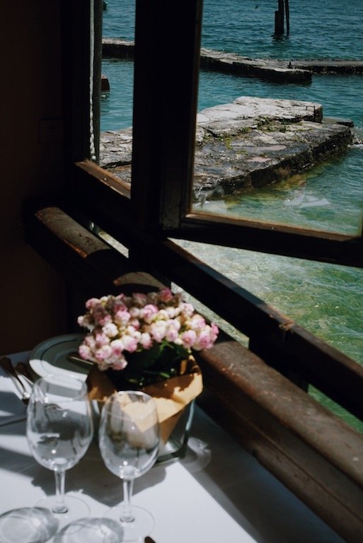 WOW und WOW und WOW, die Riva fuhr direkt vor, legte am Bootsteg an und wir wurden eingeladen, im Restaurant und Hotel San Vigilio zu essen. Dazu muss man sagen, dass der Haupteingang über Wasser zugänglich ist und das gesamte Gebäude in den See ragt. Ein wundervolles Ambiente gepaart mit einem unglaublichen Ausblick. So habe ich noch nie meinen Lunch gegessen. Das Buffet inklusive Wein und Kaffee kostet zwar 50 Euro pro Person ist aber jeden Cent wert und selbst als Veggie wird man gut satt, obwohl der Fisch besonders empfohlen wird.