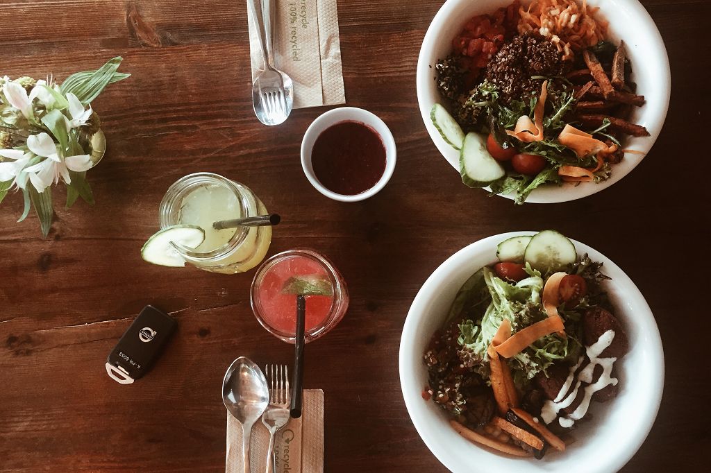 Dieses Restaurant ist relativ neu in Berlin, bietet köstliche vegane und teilweise Raw-Spezialitäten an und das serviert in Schüsseln. Bowls eben. BTW, hier sieht die Schüssel viel kleiner aus, als sie in Wirklichkeit war. Ich hatte Falafeln, Süßkartoffeln, Quinoa, gebratenes Gemüse und Humus. Meine Bowl hatte 9,90 gekostet, dazu hatten wir noch einen frischen Saft aus Ingwer und Blutorange.