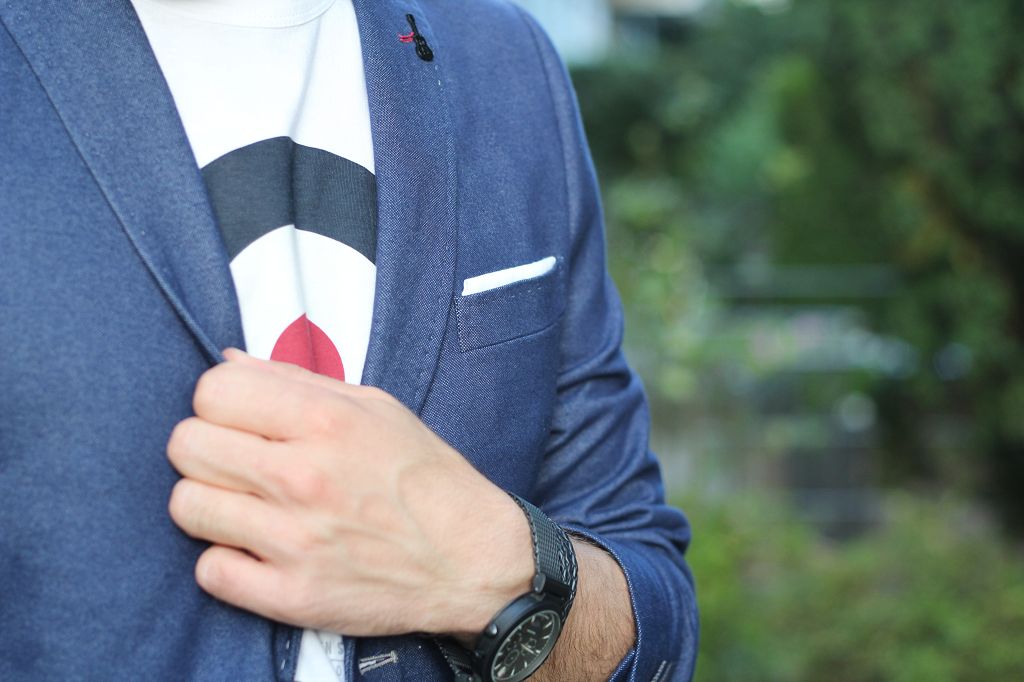 Das Sakko ist aber mit den vielen kleinen Details eine super Wahl und auch das T-Shirt passt. Kein penetranter Print, der alle Augen auf sich zieht. Klassisch und schick, für Alltag und Büro.