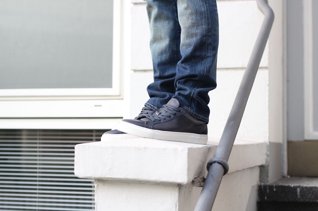 Der erste Look zeigt ein komplettes Outfit von Modomoto Stylistin Birgit und wie sie Lucas Business/Casual kleiden würde. Ihr Wahl fällt auf eine 501 von Levi's, ein T-Shirt mit dezentem Print und einem Jacket mit kleinen Raffinessen, dazu hat sie blaue Leder-Sneaker kombiniert.
