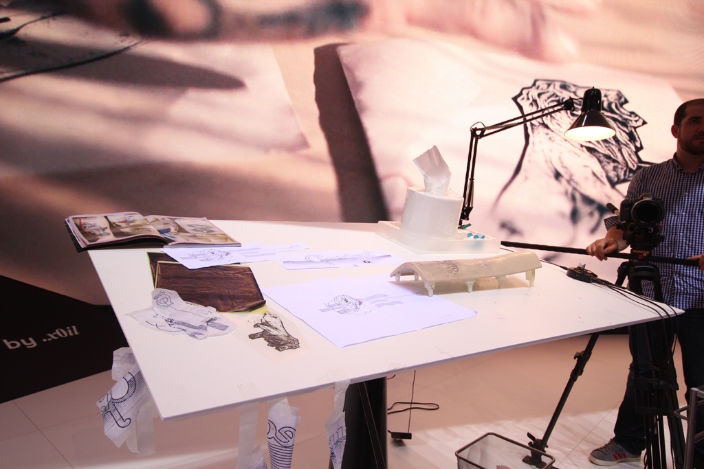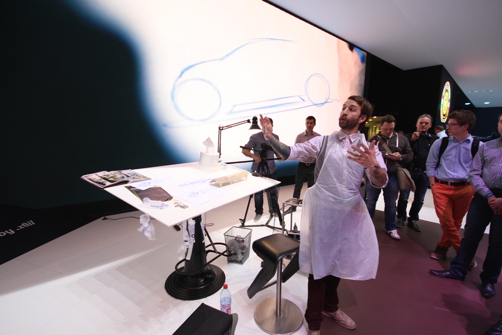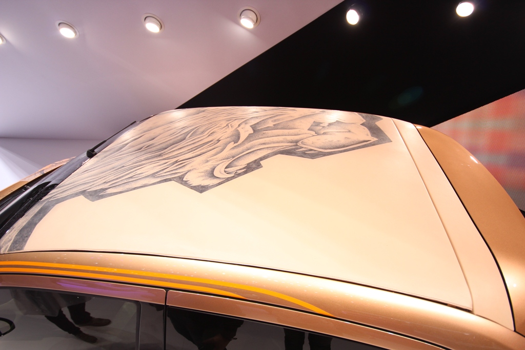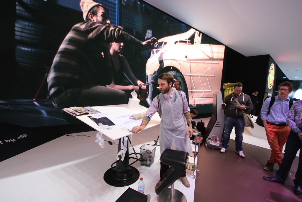 The famous French tattoo artist xOil, known for his special look of its work by doing tattoos in a style that associates graphic patterns and motives drawn from history, was invited by Gilles Vidal (Peugeot Design Manager) to design an incredible tattoo for Peugeot to explore the possibility of creating a unique personalized vehicle. xOil was given the freedom to express his talent to create a vehicle which pushes personalization to its extreme. The artist drew a lion comparing Peugeots history with the new by using the logo from 1920 with the proud and conquering lion and the active and dynamic lifestyle of 2014. One of the biggest challenges was to learn the difference between human skin and leather because of the absorption of color and the dryness.