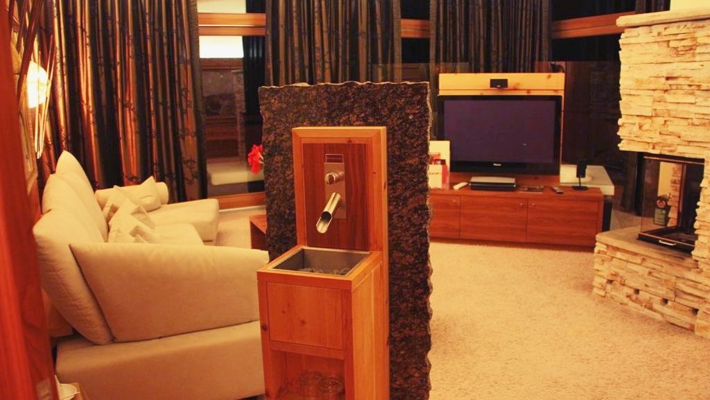 Die Zimmer und Suiten können das Erlebnis in Entree nur überbieten. In dem von mir bewohnten Penthouse Adlerhorst wurde das Wellnesskonzept bis in das Wohnzimmer hinein durchgezogen. Die Räumlichkeiten boten auf knapp 100qm eine Sauna und Badewanne für vier Personen, einen Kamin, Trinkbrunnen und mindestens genau so große Terrasse mit Blick auf die Zugspitze, von den zwei getrennten Schlafgemächern mit eigenem Bad mal abgesehen.